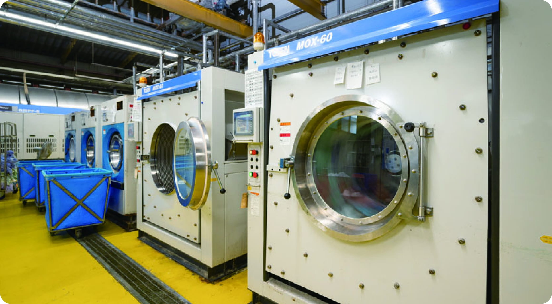 回収したリネン・タオル・病衣・ユニフォーム・私物衣類などを種類別に分け、それぞれ専用の大型洗濯機で洗濯処理を行います。洗濯前には丁寧な検品も実施することで、交差汚染や二次汚染、異物混入のリスクを徹底的に排除。清潔で安全な商品をお客様のお手元までお届けいたします。